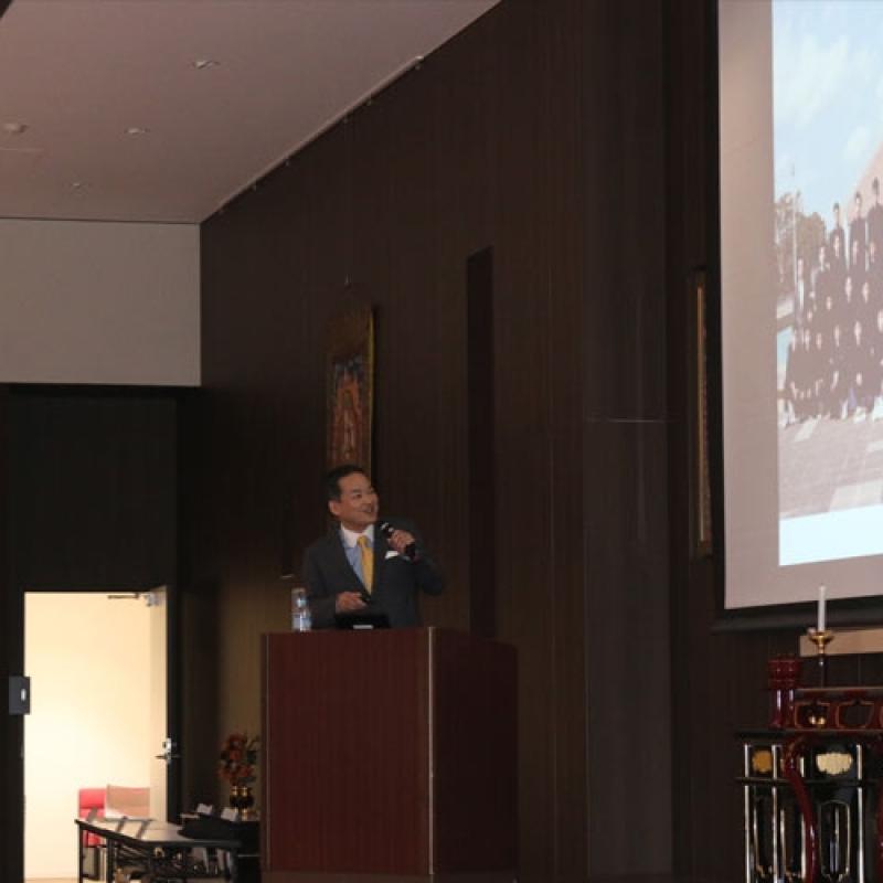 開会に先立ち、平岡英信名誉会長(清風学園理事長)のご挨拶の中で、新校舎の紹介や開催場所であるラカンホールに鎮座されている弘法大師座像に関してもご紹介をされました。