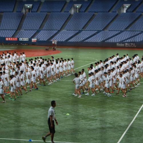 時代は変わる。学校行事の体育祭も今年(2015年)から京セラドームでの開催となりました。 まず思うのが少年時代野球選手に憧れ毎日少年野球で汗を流した自分としては野球場のグランドに入れるなんて・・・ 羨ましい!!というのが感想第一。次に思うのが盛り上がってる体育祭をみて本当に現代の子供たちは恵まれてるなーと。 その分”子供達はいい子でいなければいけない”みたいな社会でもあるから良し悪しかな。のびのびしていた社会から表面上のびのびしている 社会になってる気がして・・・すいません余計な話をしてしまいました。話は体育祭に戻り、丁度競技は部活対抗リレー。 みんな部活に関連した格好、物を着たり持ったりして走る走る。もうこれはハローイン状態。リレーの速さは二の次で会場内盛り上がりまくってました。 スタンドで観戦している生徒もグランドで汗を流してる生徒も右往左往している先生方も本当に楽しそうでした。