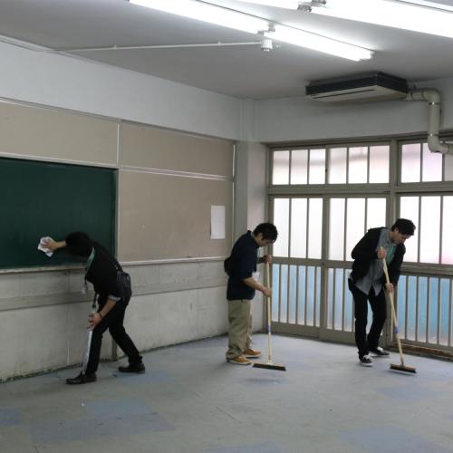 OBの皆様にもなじみの深い円形校舎がついに建て替えです。 宕峯会では同窓会、総会、懇親会を兼ねた円形校舎大掃除会を2015年4月5日に行いました。 参加者全員で最後の掃除です。この校舎はいったい何人の生徒を送り出したのか?ふと思います。 落ちついて見てみると色々な部分で歴史的建造物を思わせる部分があり建物的にも素晴しいものだったんだなーとしみじみ。 机も生徒もいない円形校舎。校舎としての役割を終えた円型校舎。ありがとう円形校舎と参加者OBの皆様は心の奥でつぶやいた事でしょう。
